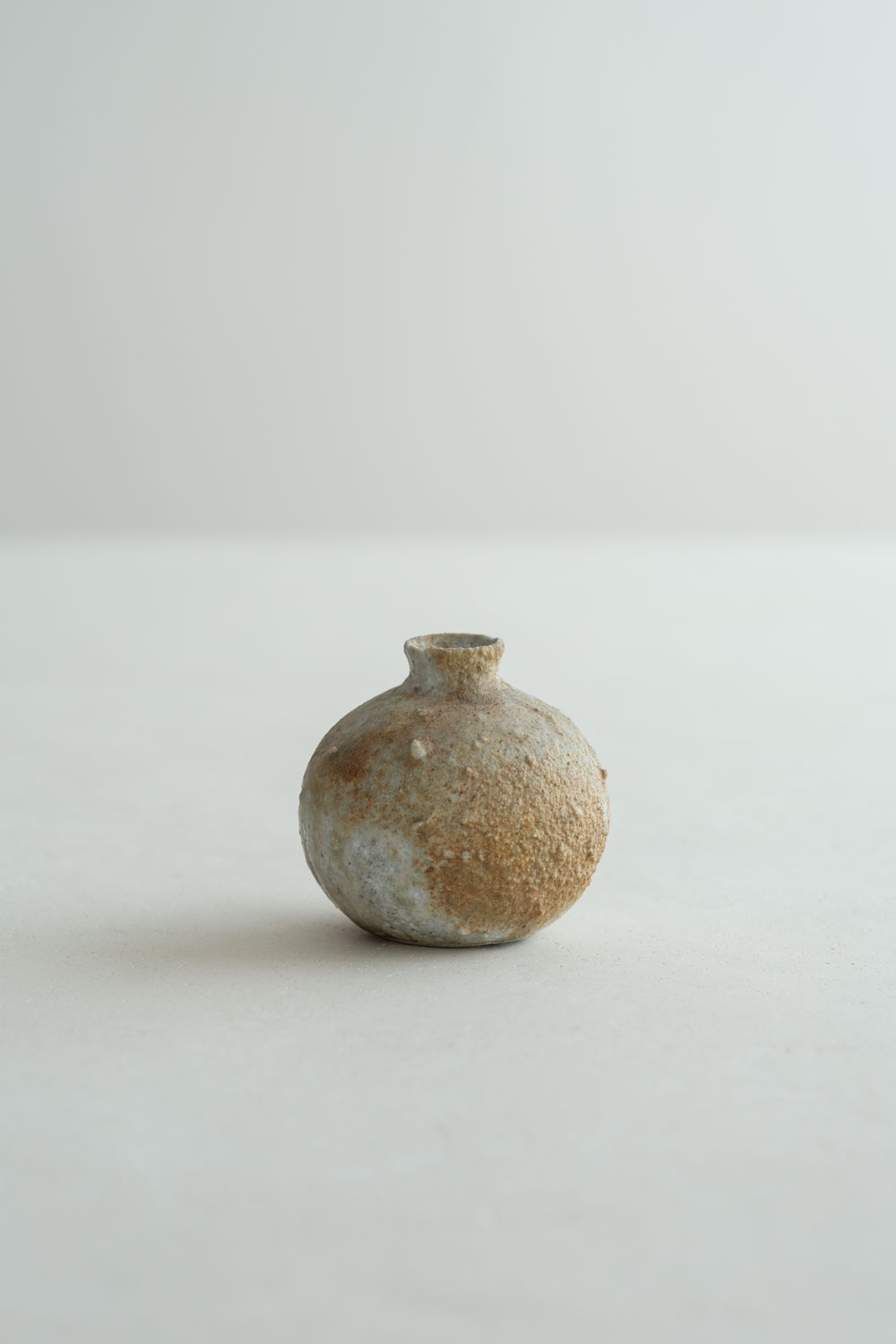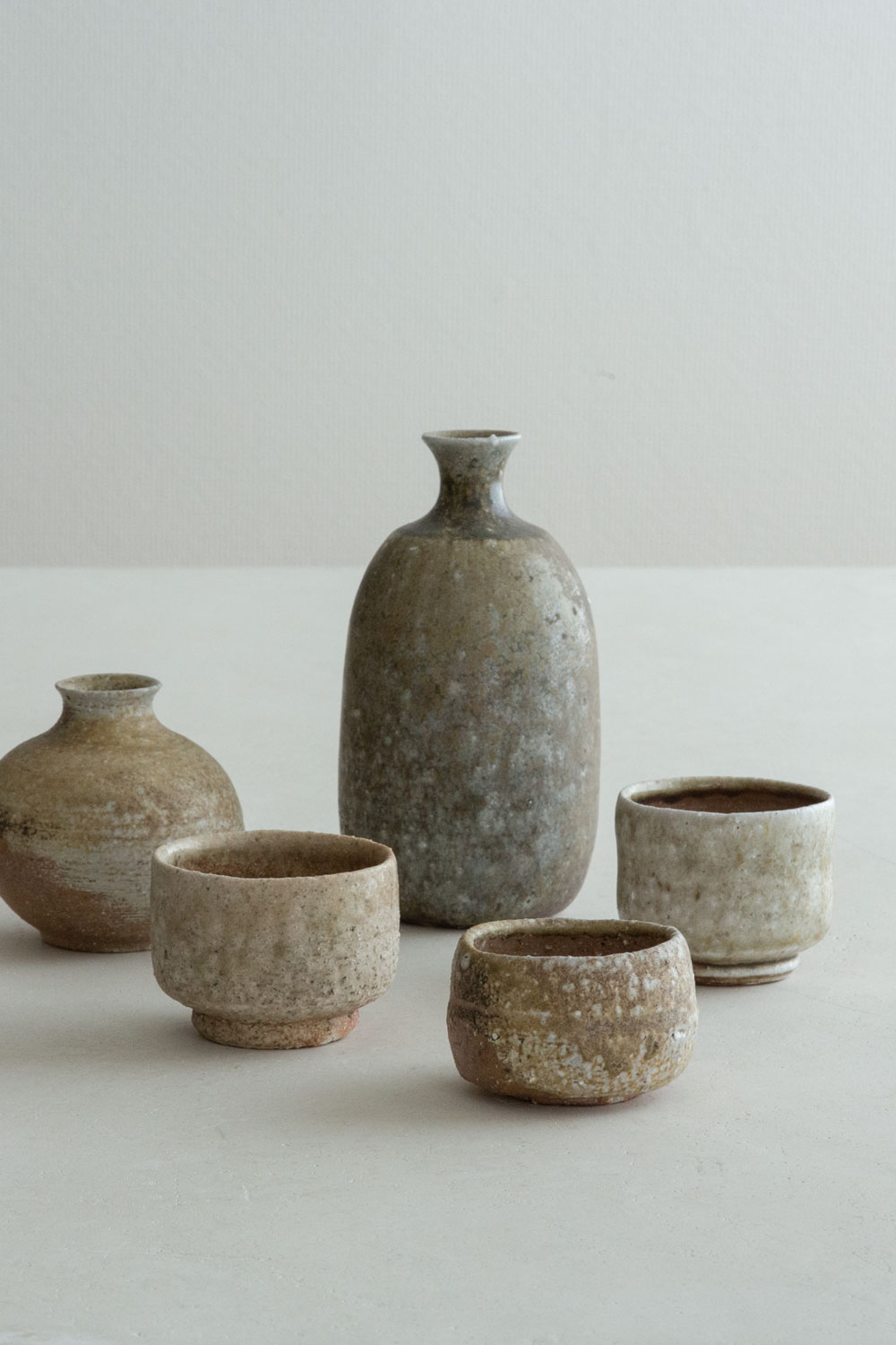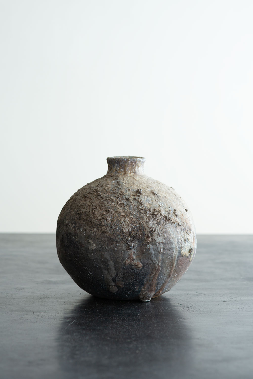 静岡県興津の高根山の麓に、独学で穴窯を築いたのは、今から37年前のこと。みかん畑の斜面を利用した、煙道の長い穴窯は「髙根窯」と命名。紐づくりの手びねりに生涯こだわり、薪窯焼成にはみかんの薪も使用。温かみのある土味に、白っぽいみかん灰をまとう作品や、鮮やかなブルーに窯変した作品、未発表の大作などがあります。今回の小展では、その中から薄造りの大壺、これでもかというほど灰を被ったオブジェ、みかん灰らしさが薫る小さなものなどをいくつかご紹介します。こだわり抜いた手仕事は、スッとそこに佇む端正な大作を生み出し、小さなぐい呑みひとつにしても、ハッとする手取りの良さがあります。温かみ、やわらかさ、軽やかさ、追い求めた造形…。ぜひ、お手にとって味わっていただきたい作品です。