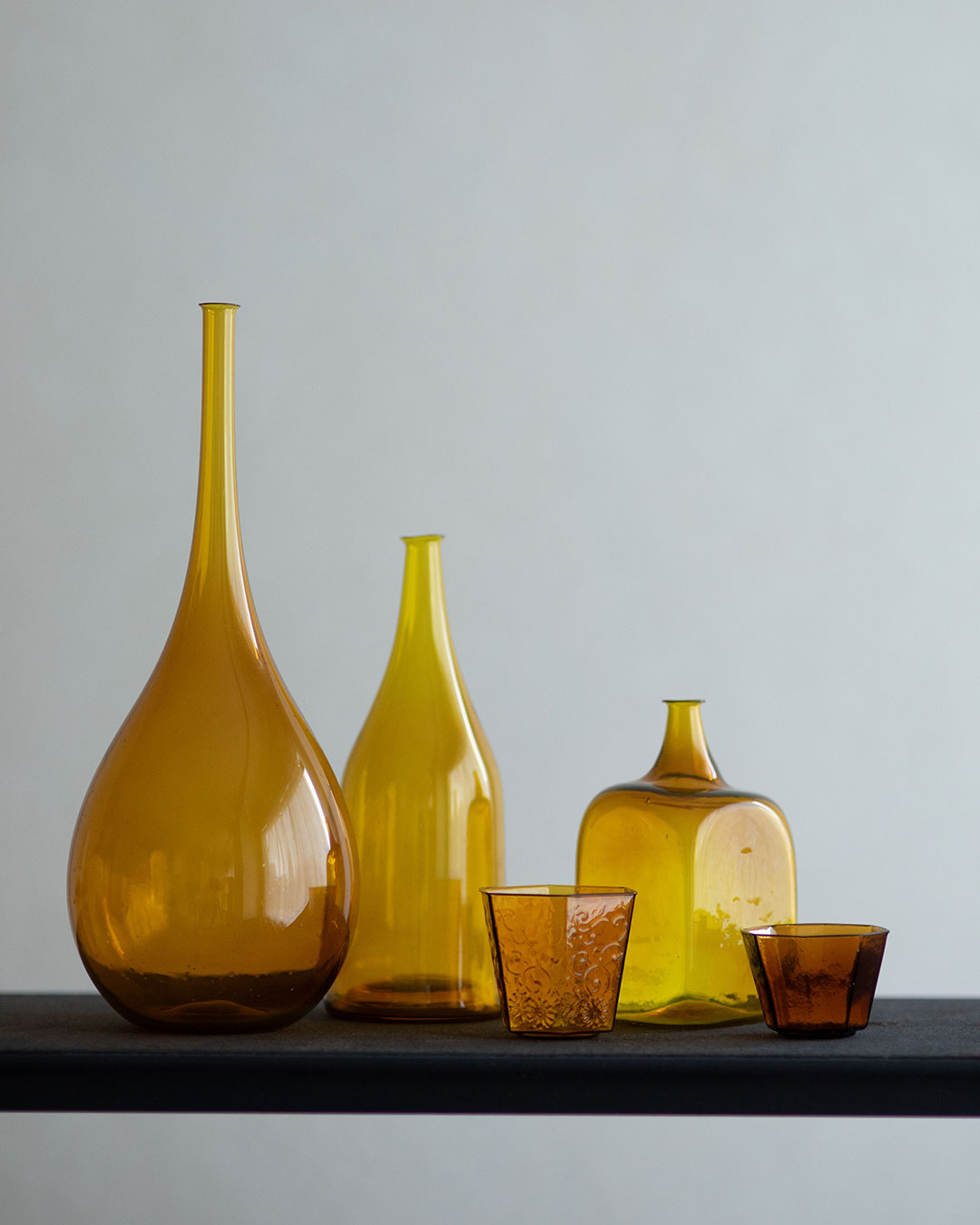 透明、青藍色をはじめ、今展では小澄さんの目指している黄色(茶と黄の間の色)など、ガラスの色合いによるさまざまな表情もご覧いただけます。